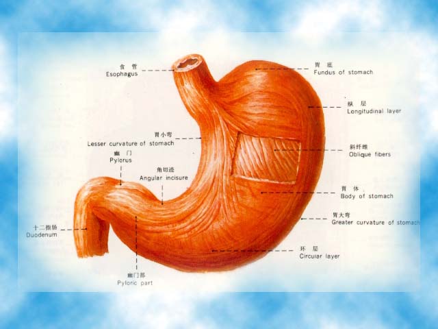 胃是消化管最膨大的部分,上接食管,下连十二指肠。胃的形状和大小随其内容物的多少而不同,充盈时膨大,空虚时可缩成管状。胃有前壁和后壁,前后壁相连处呈弯状,为胃的小弯和大弯,胃的入口为贲门,出口为幽门。胃可分成4个部分:贲门部、胃底部、胃体部和幽门部。胃的粘膜层内含有许多腺体,以其部位不同分为3种:贲门腺、胃底腺和幽门腺。
